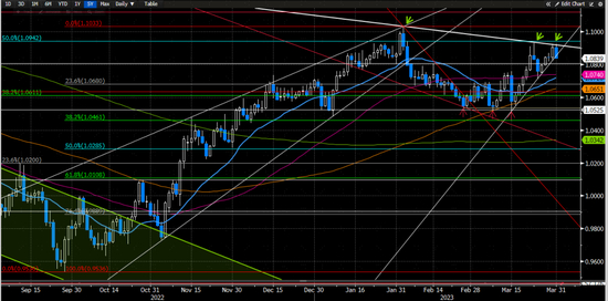 欧元在3月份一路走高并一度上测了年内次高点1.0930附近阻力(这里也是2021年以来的下降趋势线阻力所在,图表33中白色线)。月内看,周线级别上21周均线以及去年9月低点以来的上升趋势通道的下线(图表33中绿色上升通道)支撑1.0620附近将在月内提供关键的支撑(图表33中右侧红色箭头),如果欧元多头可以成功守住这一关键位置,那么则有机会上测上方阻力即年内高点1.1030附近;否则一旦欧元空头在月内成功压破这一位置,那么欧元趋势性走低的概率则大增,而下一个支撑则位于55周均线1.0450附近。另外,从日线级别上看,上周欧元多头在2021年以来的下降趋势线阻力1.0930附近遇阻后出现回落,短期内如果不能有效向上突破,接下来走出双顶形态的概率大增(图表34),下方近期支撑位于21天均线1.0720附近;如果欧元多头再次失守,100天均线1.0650附近则将成为欧元空头的下一个目标。