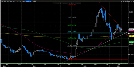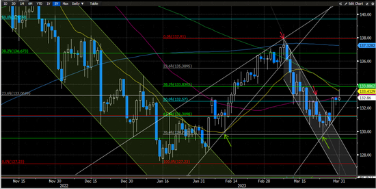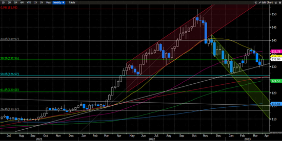 我们在2月外汇月报中提示的“上升楔形”预示的下跌风险在3月得到印证(详见[14] 《美元的反弹动能或边际减弱》技术分析部分),美元/日元在3月月内一度大幅走低800基点左右,连续3周的大幅下跌使得日元多头在3月最后一周内开始获利了结,而美元/日元也如期在76.4%斐波那契回撤位附近找到支撑之后出现明显反弹(图表35中右侧绿色箭头);日线级别上看,美元多头能否继续向上突破100天均线附近阻力133.90(这里同样是38.2%斐波那契回撤位)将决定短期的走势;而周线上看,22年3月以来的上升趋势虽然目前依旧有效(图表36中白色上升趋势线)但考虑到21周均线(图表36中黄色线)自上而下穿透了50周均线(图表36中粉色线),美元/日元在月内走低的风险依旧存在,尤其如果美元空头可以跌破近期下方关键支撑130附近,那么年内低点127.30附近则会成为美元空头的下一个目标。短期内,在美元多头有效突破21周均线133.75附近阻力之前,美元/日元大概率会维持区间震荡的走势,4月月内需要关注去年3月以来的上升趋势能否维持有效(即130附近的关键支撑所在位置)。