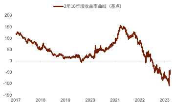银行业风波背景下市场风险偏好月内明显走低 经济衰退预期更进一步 3月由硅谷银行引发的银行业风波成为市场关注焦点,市场风险偏好一度出现了明显的回落,但3月下半月随着美国官方救助银行业的一系列措施(比如美国财政部重申[9] 其和美联储以及联邦存款保险公司准备再次应用他们在 SVB 和 Signature Bank 倒闭时用来保护储户的工具,而且表示,如果有必要,将准备采取额外的行动。)使得市场情况有所好转:FRA-OIS利差自月内高点有所回落,VIX也在3月下半月自高位回落。而最新美联储H8报告有关美国商业银行资产负债表显示,在截止15号当周录得历史上最大幅度的单周净流出1500亿美元后,截至本月22号当周的美国小银行(资产规模排名前25之后的小型商业银行)单周存款录得58亿美元净流入;这些都表明市场的极端恐慌情绪有所消退。不过目前看市场的担忧并未彻底消退:美国KBW银行指数3月月内依旧大幅走低20%左右,目前仍然在最近2年多以来的低点徘徊(图表11),而美国金融市场条件在月内也出现明显收紧,避险资金的助推使得美债利率月内出现大幅回落,2年美债利率一度大幅走低120基点,10年美债利率也一度走低60基点左右,而整个2年10年段收益率曲线则录得2013年以来最大幅度的月内走陡(图表12),而根据历史上美国经济进入衰退前收益率曲线自倒挂状态重新走陡的规律,如果这样的走陡趋势继续在4月有所延续,这或许表明市场对美国经济进入衰退时点的预期更近一步。