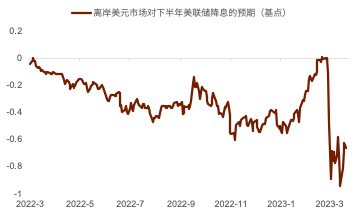 在此背景下,市场对美联储本轮加息终点利率的预期也自月初的5.4%附近下行至目前的4.9%附近(图表13),离岸美元市场对今年下半年美联储降息的预期也大幅走高(图表14)。