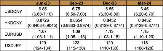 微调美元/人民币汇率预测中枢 从具体节奏看,我们维持美元人民币先反弹后向下的判断不变。考虑到近期美国出现的金融系统性风险,今后美联储货币政策或边际偏鸽,我们将美元人民币汇率在2季度的中枢由6.95附近下调至6.85附近,2023年四季度中枢预测仍为6.55。此外我们对2024年一季度美元人民币汇率的中枢预测为6.45。
