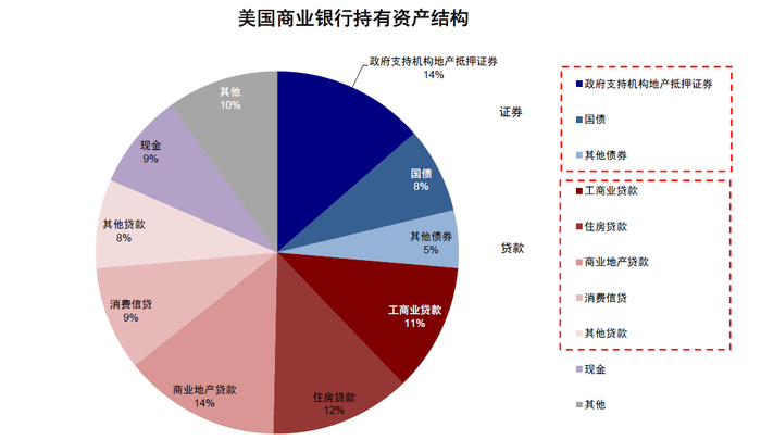 证券资产中,政府支持机构地产抵押证券(agency or GSE MBS,简称政府支持机构MBS)占全部证券的52%、国债占29%,其他证券(私营机构及地方MBS等)占19%。贷款资产中,工商业贷款占全部贷款的21%、住房贷款占23%、商业地产贷款占25%、消费信贷占17%。