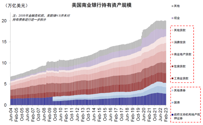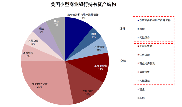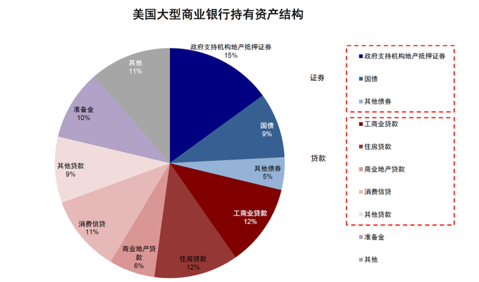 美国商业银行持有金融资产20万亿美元,其中贷款占六成、证券占三成。相比大银行,小银行持有的证券占比更低、贷款更高,且贷款中商业地产贷款占全部贷款比例达五成。