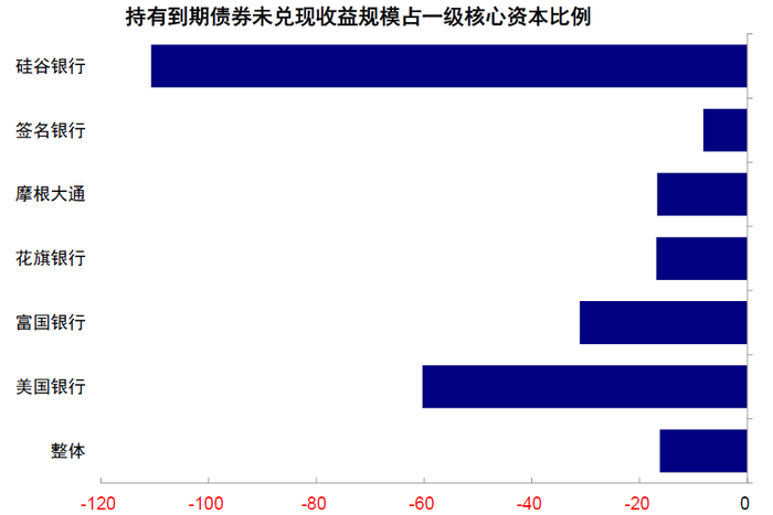 2)整体银行业未兑现损失占CET1比例不高,硅谷银行持有到期债券未兑现损失占其一级核心资本比例超110% vs. 整体仅约16%。