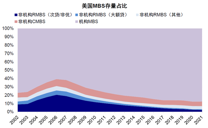 具体看,2008年金融危机后,信用风险相对更低的政府支持机构MBS存量规模及占全行业存量占比快速抬升,而私营机构MBS快速回落(私营机构MBS规模从金融危机前的3.5万亿美元回落至2021年末的1.5万亿美元,占全行业MBS存量比例从39%回落至12%),占全部证券比例从金融危机时期的超10%回落至当前的2%。