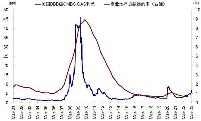 图表21:商业地产贷款违约率当前仅0.68%,与疫情前基本相当);CMBS利差仅不到5ppt,较疫情前小幅抬升