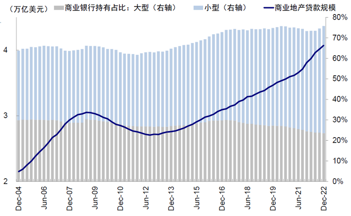 1)银行持有占存量比例很高(银行持有商业地产抵押贷款规模占存量比例达77% vs. 住房抵押贷款的16%;其中大银行持有24%、小银行持有43%);