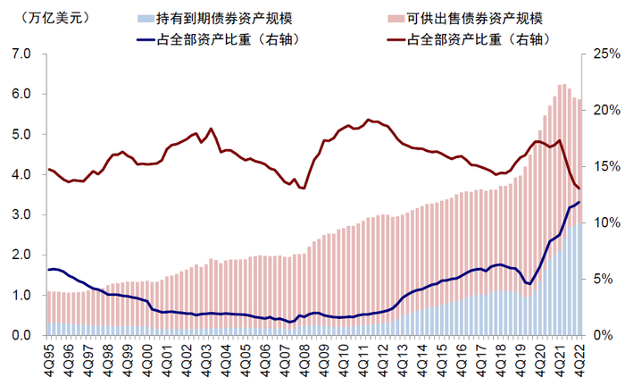2011年以来,为满足更为严格的资本充足率要求,美国商业银行持有到期债券占比显著增长(2022年四季度占全部资产比例11.8% vs. 2011年一季度1.7%);可供出售债券规模占比下滑(2022年四季度13.0% vs. 2011年一季度18.6%)。
