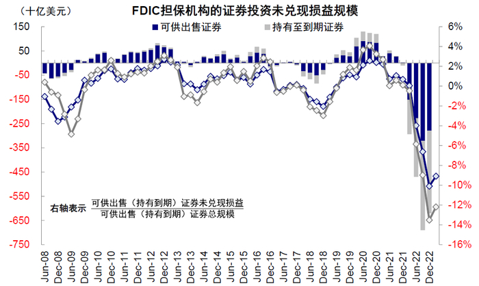 不过,如果面临类似于近期的突发流动性压力迫使银行需要提前抛售的话,这些未直接提前在账面上的“未兑现损失”也就会变成实际损失,近期硅谷银行便是如此。截至2022四季度,持有到期债券和可供出售债券未实现损失分别达3401亿美元和2795亿美元。