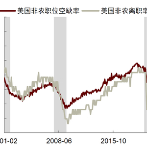 图表:美国非农职位空缺率大幅下挫,非农离职率小幅抬升,不过二者过去一段时间均趋势下滑