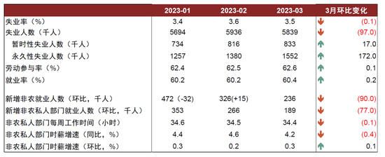 ►美国3月非农数据仍然稳健,新增就业边际上也有降温迹象。3月新增非农就业23.6万人,较上月的32.6万下滑,其中教育医疗(+6.5万人)、休闲住宿(+7.2万人)和政府部门(+4.7万人)就业增长较多,而疫情前期招聘较多的零售(-1.5万人)、临时支持服务(-1.1万人)以及建筑(-9千人)、制造(-1千人)行业的新增就业有所下降。虽然3月新增非农已是今年以来连续第三月下降,但超过20万的新增就业也仍高于疫情前水平。3月失业率再度下降至3.5%这一历史低位,劳动参与率小幅上升至62.6%,显示劳动力供给有所恢复。供给修复叠加需求趋缓,非农小时工资同比增速回落至4.2%(前值4.6%),工资通胀压力有所减弱。
