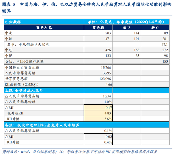 2)假设此前中国与俄、伊、法、巴双边贸易结算中均未使用人民币(事实上,2021年人民币在中俄双边贸易结算中占比已达17.9%[1]),据此简单估算我国与上述四国双边贸易全转为人民币结算对人民币国际化功能影响的上限。