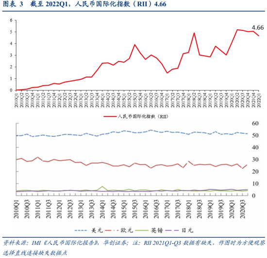 一方面,从RII绝对数值看,人民币国际化程度较美、欧仍有较大差距。IMI初步测算22Q1人民币国际化指数(RII)为4.66 ,即综合考虑人民币的国际贸易计价份额、国际金融计价份额和国际储备份额约为4.7%。21Q4,RII为505,同期美元、欧元、英镑、日元国际化指数则分别为51.8、23.13、4.06、4.2。人民币国际地位已经超越英镑和日元。但美元、欧元仍然占据相对主导地位,人民币与之相比仍有较大差距。