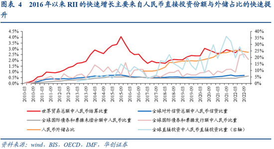 分项视角:RII指标体系中分项指标来看,近年来RII的快速提升主要依赖于人民币国际金融计价功能(直接投资、国际债券和票据发行)的提升,也反映了投融资的金融功能对于发挥国际货币职能的重要意义。人民币直接投资比重、人民币国际债券和票据发行额占比均有明显升高。前者从2017年以前的5%左右升至现在约20%,后者在2022年的提升尤为明显,从年初的1%左右升至2022Q4约2.1%。