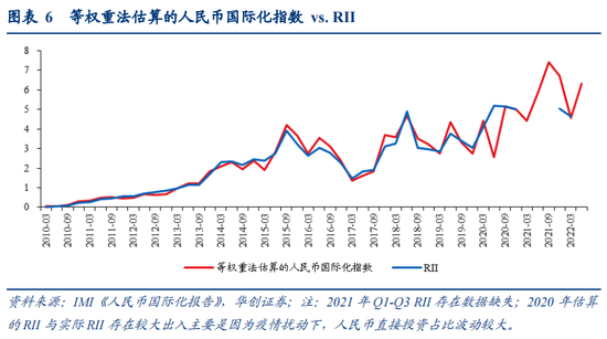 为了简化计算,估算采取以下近似原则:1)由于中国人民大学国际货币研究所(IMI)未公布RII指标体系各分项指标权重,我们将6个分项指标视作等权重,即公式(2)中“国际贸易结算份额权重”=1/6。附录中我们对比了采用等权重方式估算的人民币国际化指数与IMI公布的RII,除了2020年疫情扰动带来等权重法估计的RII波动较大,与RII实际值产生一定偏离,整体上等权重法估算的RII与实际RII的走势较为一致,因此我们认为可以将前者看作对后者的简单估计(详见附录图6)。