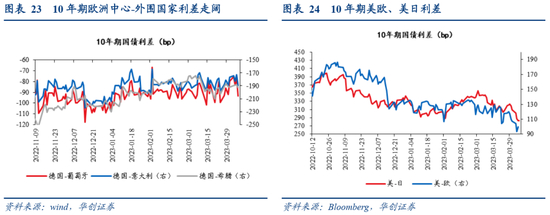 最近一周,美欧国债利差收窄,美日国债利差变化不大。4月5日,10年期美欧国债利差为100bp,较一周前收窄17bp。4月6日,美日利差为283bp,较一周前收窄36bp。