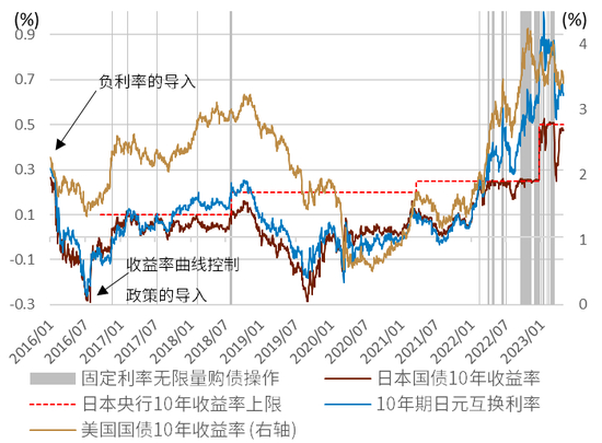 日债利率:近期日本央行在国债市场中受到的挑战较小,自今年3月9日以来,日本央行再无实施过“固定利率操作”来压低日本的10年利率(图表3)。此外、日元10年互换利率由今年1月中旬1%附近的高点附近在近期降至0.63%附近,与0.50%的10年利率上限并无太大差异(图表3)。我们认为伴随近期美债利率的下行压力,短期内日债方面的利率上行压力或依旧较低,这也意味着日本央行无需大幅购债来守住利率上限,进而债券市场的市场功能不至于进一步恶化,种种情况有利于日本央行维持现有YCC。