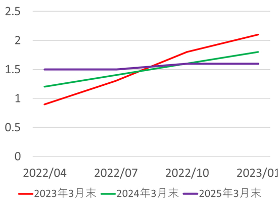图表1:日本央行政策委员会核心CPI(除去生鲜食品)同比预测值(%)