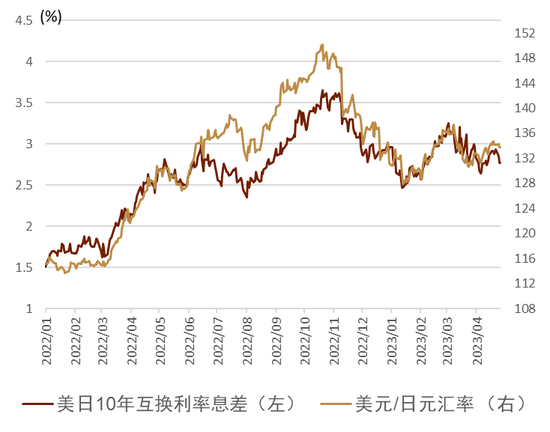 日元汇率:短期内植田行长的偏鸽态度基本已定价至目前的日元汇率之中,自植田上任以来日元相较美元贬值约1.2%,在G10货币中排名倒数第三,相对偏弱。由于定价的相对充分,因此在本次会议中哪怕植田重复以往的偏鸽态度,日元短期内发生进一步大幅贬值的可能性也较低。我们认为美日10年互换利率的息差在短期内依旧是美日汇率的重要参考(图表4),而其中美国方面的利率对美日息差的左右更大。因此、在日本央行短期内或维持不变的背景下,未来日元相较美元升贬值与否,美国的长端利率环境或起到决定性作用。