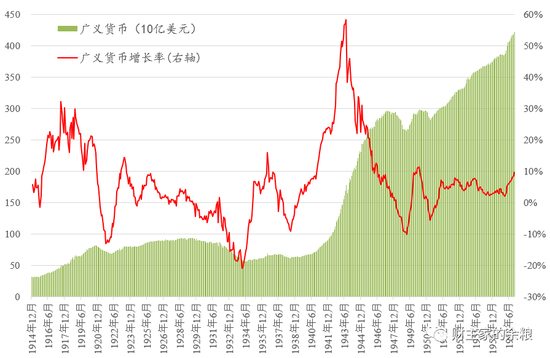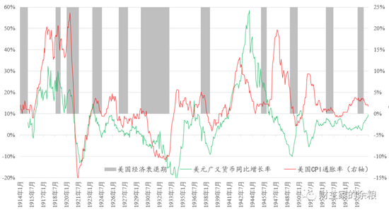 1921年-1922年的广义货币收缩,是因为此前的1916-1919年,美国参加第一次世界大战,美联储开动印钞机,压低国债利率,帮助政府实行战争融资,由此导致政府债务和广义货币供应量猛增。战争结束之后,随着货币政策的正常化,美国的广义货币出现了持续一年半的收缩,与M2收缩对应的,是美国战后的一轮深度经济衰退。