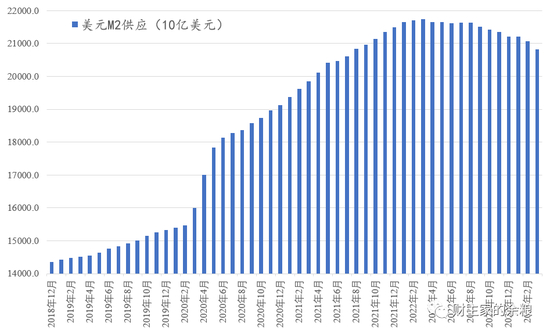 从图表上很显然可以看出,一年前的2022年3月,美元M2供应量,达到其历史的最高点21.74万亿元,然后便是迄今为止的不断萎缩。