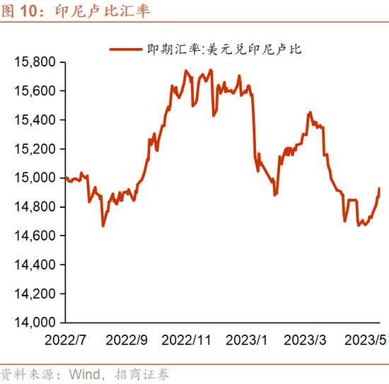 货币政策:4月18日,印尼央行如期将利率维持在5.75%不变,以维护本国经济稳定,应对全球经济放缓的影响,符合市场预期。5月8日,印尼央行行长表示,在美联储发出暂停加息的信号后,预期印尼盾将走强,印尼今年没有再次提高基准利率的计划。