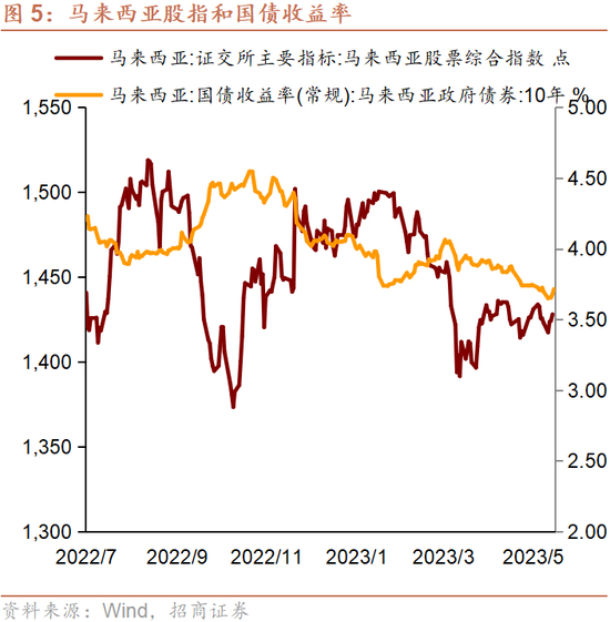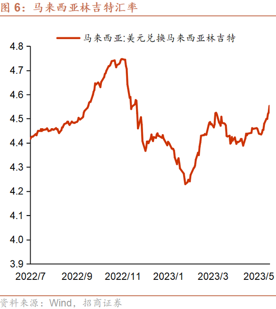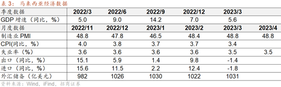 GDP:预计马来西亚经济外冷内热。今年一季度马来西亚GDP同比增长5.6%,好于预期,私人消费增长是增长势头良好的主要因素。马来西亚央行预计 2023 年 GDP 增长将放缓至 4.0%-5.0%,原因是全球性的经济增长放缓。国内因素则带来经济上行风险,包括劳动力前景的改善、投资项目和旅游的增加等。