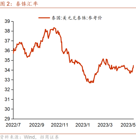 通胀:4月泰国CPI同比上升2.7%,较3 月的 2.8% 继续略有回落,连续第4个月放缓并达到16个月以来的最低水平,处于泰国央行设定的1-3%目标区间。考虑到主要原因是上年同月基数较高,且燃料价格相较去年处于较低水平,部分产品和服务价格也有所下降,预计5月通胀率将会大幅下降。泰国商业部预计2023年全年通胀率将在1.7%-2.7%(中值2.2%)。