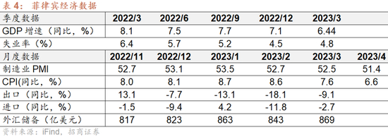 GDP: 一季度菲律宾GDP同比增长6.4%,较上个季度的7.1%有所放缓,是自2021年一季度GDP收缩3.8%以来的最低增速。农林渔业、工业和服务业分别同比增长2.2%、3.9%和8.4%。菲律宾经济规划部门预期能够实现今年GDP增长6.0-7.0%的目标。