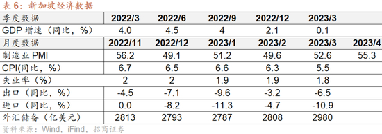 GDP: 2023年一季度新加坡GDP同比增长0.1%,低于去年第四季度修正后的2.1%,也低于经济学家预期的0.6%。其中,商品生产行业萎缩4.1%,服务生产行业扩张1.8%,制造业活动收缩6.0%,建筑业增长8.5%。