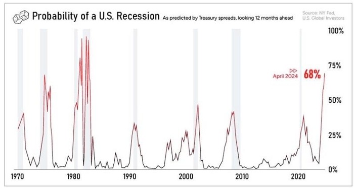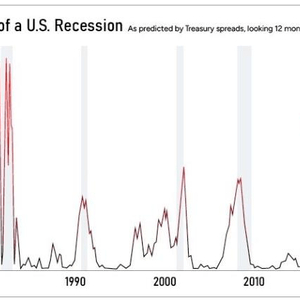 高利息会减缓经济增长,因为它会抑制支出和承担新债务。在下面的图表中看到,人们已经预料到了更为悲观的经济形势,这是自1983年以来的最高概率。