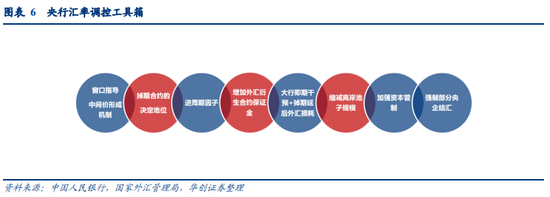 此外,央行其他的汇率调控工具也尚未动用。央行对汇率调控的工具箱中包含了诸如中间价窗口指导、调控掉期点、逆周期因子、增加外汇衍生合约保证金、大行干预即期市场、缩减离岸人民币池子、加强资本管制、强制部分央企结汇等,目前来看均未动用,政策工具箱储备充足。