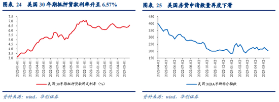 抵押贷款申请数量下滑。5月19日当周,美国MBA市场综合指数(反映抵押贷款申请数量情况)降至205,环比一周前回落约4.6%,相较两周前-10%。