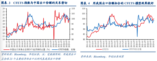 另一方面,从一篮子汇率角度定量评估。由于CFETS指数的编制本质是出口权重为主的指数,因此跟出口份额关系较好。2015年,一篮子走强与出口竞争力是反向的,因为当时CFETS锚定美元相对一篮子货币被动升值,而出口份额一路回落;当下的一篮子走强与出口竞争力同向,体现出汇改后的汇率是基于供需交易的结果,出口份额升高支撑CFETS走强。因此,用我国出口份额拟合CFETS指数。