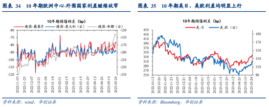 美欧、美日国债利差明显走阔。5月25日,10年期美欧、美日国债利差分别为124、339bp,分别较一周前走阔11、13bp。
