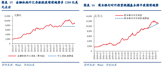 二是商业银行的待结汇资金,可用商业银行对外投资规模衡量,其表示的是居民和企业部门与商业银行结汇后,商业银行未与央行进行结汇而是直接进行对外投资的资金规模。当下商业银行对外投资规模基本持平疫情前趋势,表明当下商业银行或已无积压的待结汇资金(图16)。