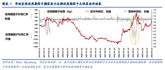 另一方面,华创宏观汇率模型并未捕捉到逆周期因子可能有所动用的迹象。央行并不公布逆周期因子,我们试图以模型拟合结果捕捉逆周期因子的动向,当模型拟合出的逆周期因子估算值(也可以称为逆周期因子的影子变量)朝单一方向波动较大时,表示央行逆周期因子有所动用的概率可能较高。5月以来,我们模型测算的逆周期因子估计值在-50bp附近波动,而以往汇率快速贬值期,我们的逆周期因子影子变量波动较大时,往往会降至-100bp以下,甚至突破-1000bp(如2022年8-10月)。
