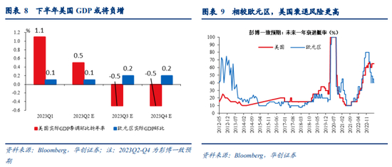 3)后续判断:目前来看美元指数后续缺乏持续走强的动能。一方面,欧美货币政策分化不利于美元。美联储6月大概率暂停加息,而欧央行虽然接近加息周期尾声,但估计仍有1-2次加息。另一方面,美国相对欧元区衰退风险或更高,经济因素或也难支撑美元持续走强。彭博一致预期,今年下半年美国GDP环比或将陷入负增,而欧元区仍在0%以上;同时市场预期未来一年美国衰退概率65%,而欧元区仅为40%。