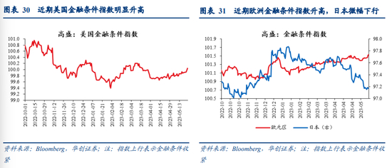 近期欧美金融条件指数明显升高,日本微幅下行。5月25日,美国、欧元区、日本金融条件指数分别为100.03、101.53、97.17,一周前分别为99.9、101.44、97.21。