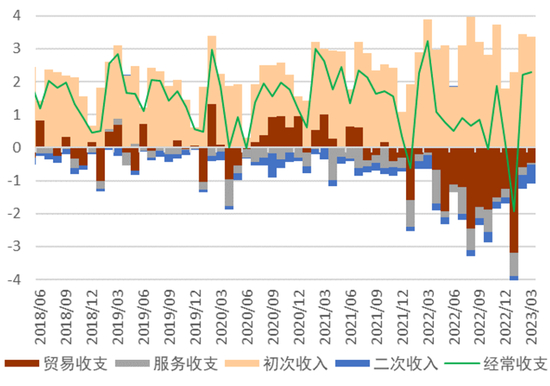 ► 季节性的购汇需求:居民方面,此前受疫情因素压制的旅游需求在今年的假期,如五一劳动节等得到了释放,叠加企业方面年中开始的分红需求增加,服务贸易与经常转移等项目逆差加大,挤压了货物贸易顺差优势,进而季节性地造成人民币汇率承压。