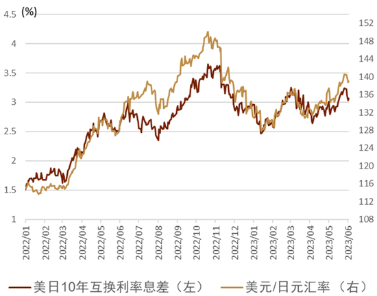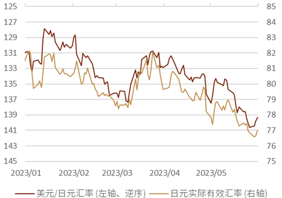 关于日元在今年上半年偏弱的原因,我们认为日本因素影响为主与美国因素影响为辅。日本因素方面主要来自于4月就任的新任日本央行行长植田和男的偏鸽的货币政策态度(详情参考:《中金看日银#19:植田就任发言——“正常化”或更晚更缓》),植田行长的相关态度打消了市场对日本央行早期放弃或调整YCC的期待,同时在日本近期的通胀上行带来了通胀预期的高涨,在此背景下日本的实际利率进一步下探,即在实际层面日本央行的货币宽松力度有所加强,因此带来了日元的贬值。美国方面因素主要来自于美债利率基本为震荡横盘走势、并未出现下行,从而导致美日息差未能明显收窄,日元难以升值。
