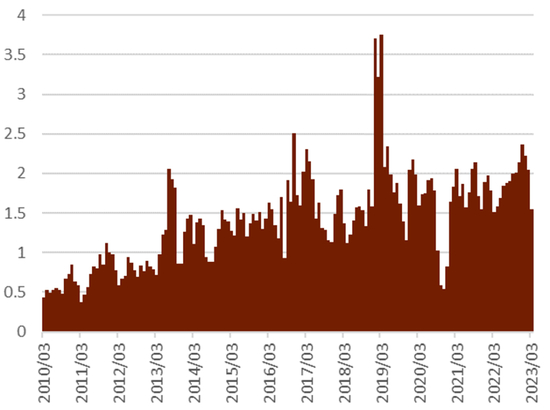 我们认为日元汇率超预期走弱的风险可能也分别来自美国与日本。美国方面,如果美国经济今年下半年依旧强劲、出现美国经济“一枝独秀”的情景,则降息预期或进一步延后。在此背景下,美国的利率或依旧维持在高位进而可能会触发美日汇率套利交易的可能性,进而形成日元贬值的力量。日本方面,在日本通胀持续上升的背景下,如果日本央行依旧维持货币政策不变,那么从实际利率角度来看日本央行是在加码宽松。在以上背景之下,美元/日元汇率存在2023年内挑战145-150区间的可能性,届时日本政府或重启外汇干预,防止日元的进一步大幅贬值。