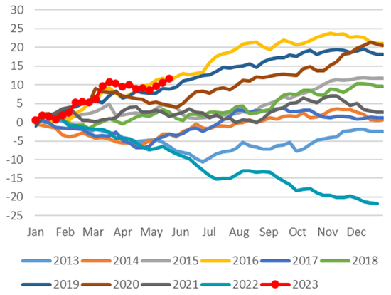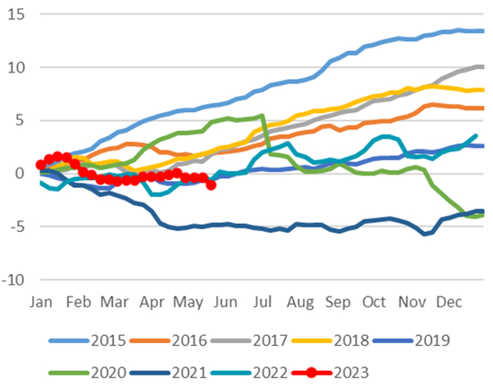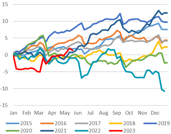 自年初以来美日汇率处于震荡偏弱的走势。1月期间受22年12月日本央行突然上调YCC上限以及12月美国经济数据偏弱的影响,美日汇率一度跌破128。进入2月之后,伴随美国1月经济数据的反弹,美债利率有所上行,美日汇率也出现反弹从128上行至136。然后3月期间,伴随欧美部分银行破产所带来的避险情绪,美债利率再度下行,美日汇率也重新下行并一度跌破130的关口。4月之后,美债利率基本走平背景下,受日本央行新任行长植田的鸽派发言的影响,美日汇率再度上行至135附近,日元成为4月最弱G10货币。5月期间,在强美元的背景下日元虽摆脱了最弱货币的局面但扔相较美元贬值,并于5月下旬期间突破140关口并触发了日本当局对汇率的口头干预(图表40)。截至5月底,年初以来日元相较美元共贬值5.90%(图表41),为仅次于挪威克朗的第二弱G10货币,并为最弱亚洲货币。