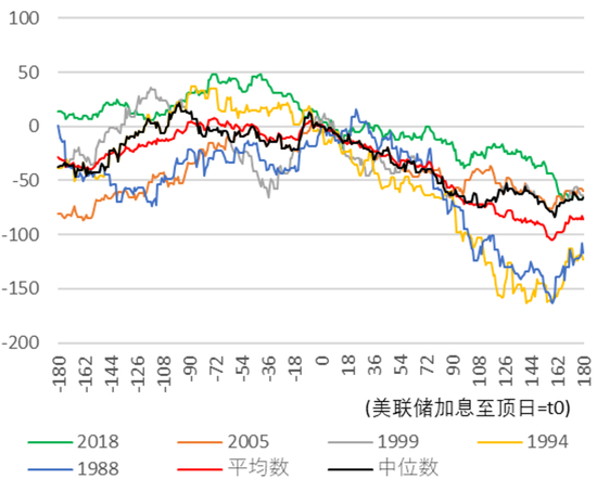 图表54:美联储加息至顶日180天前后的美债10年利率变化幅度(bp)