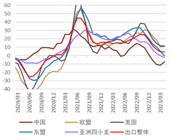 ► 贸易收支:2022年期间由于能源价格的大幅抬升,日本记录了历史性的贸易逆差。2023年上半年期间贸易逆差有所收窄(图表48),主要来自于能源价格的收窄带来的贸易条件的改善(图表49)以及进口金额的减少。虽然进口金额有所减少,但因出口的因素,今年下半年我们很难预测贸易收支的大幅顺差。出口方面,在欧美收紧货币政策背景之下,日本向大部分经济体的出口都出现了放缓,今年下半年可能会出现同比转负的情况(图表50)。因此我们认为今年下半年进出口的金额或同时出现缩小,贸易账户更多为中立方向。