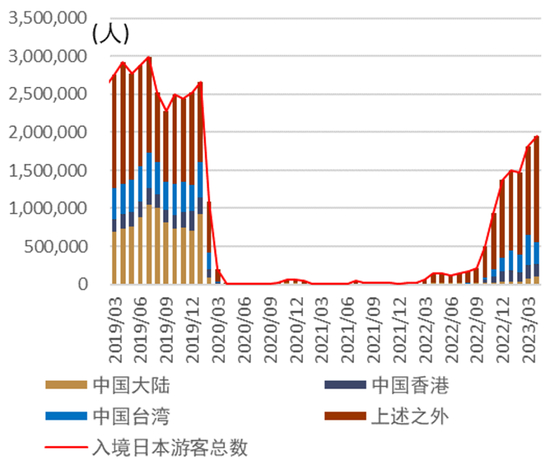 ► 服务收支:疫情期间由于外国游客的缺失,日本的服务收支陷入了每月近1万亿日元的逆差情况(图表48)。但伴随疫情的结束,入境日本游客有所增多(图表51),日本的服务逆差也有收窄的迹象。目前日本已大幅放松了外国游客入境的管制、同时日元汇率处于弱方,日本的物价对外国游客有着充分的价格优势。我们认为2023年下半年入境日本的游客或持续恢复,服务收支的逆差或持续缩小,进而日元贬值的压力也会有所减弱。