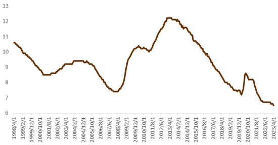 始终火热的就业市场和颇具粘性的通胀是上半年美国经济数据的亮点,考虑到就业是经济的滞后指标,我们认为当前就业市场中不利因素的累积同样暗示着美国经济趋弱的可能性。尽管当前美国私营部门的时薪增长率处于历史较高水平,但美国名义GDP的回落或意味着企业的盈利能力有所收缩,进而对企业扩大招聘的能力产生不利影响(图表5),美国失业率或面临走高压力。美国中小企业雇佣计划指标的明显回落或也意味着当前美国的就业市场正在趋冷(图表6)。此外,虽然美国4月份通胀数据回落速度依旧较慢,但包括房租在内的黏性较强的分项环比增速正进一步走低,叠加美国就业市场趋冷的潜在可能,我们认为下半年美国通胀或将持续走低,尽管回落的斜率仍有不确定性,但失业率走高+通胀进一步回落的数据组合或能进一步强化美联储货币政策的转向预期。
