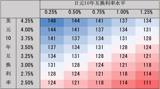 去年以来,美日息差一直是左右美日汇率的重要参考(图表52)。由于日本央行对10年利率设有上限,因此我们选用自由度更高、更能反映市场情绪的日元10年互换利率作为息差的计算依据。在此背景下,基于过去1-2年的互换息差的走势,我们制作了美日互换利率对应的日元汇率预测矩阵(图表53)。往年底走,我们认为美国10年互换利率或下行至3.0%左右、日本10年互换利率或上行至0.75%附近,在此背景下美日汇率或在124-125附近。