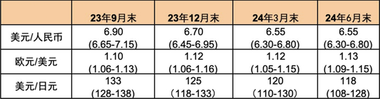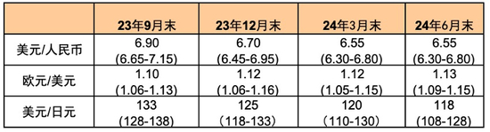 图表:汇率预测表 (上段为中枢、下段为区间)