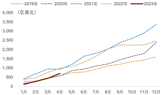 图表43:年初以来日本对外国中长期债券净投资累计额 (万亿日元)